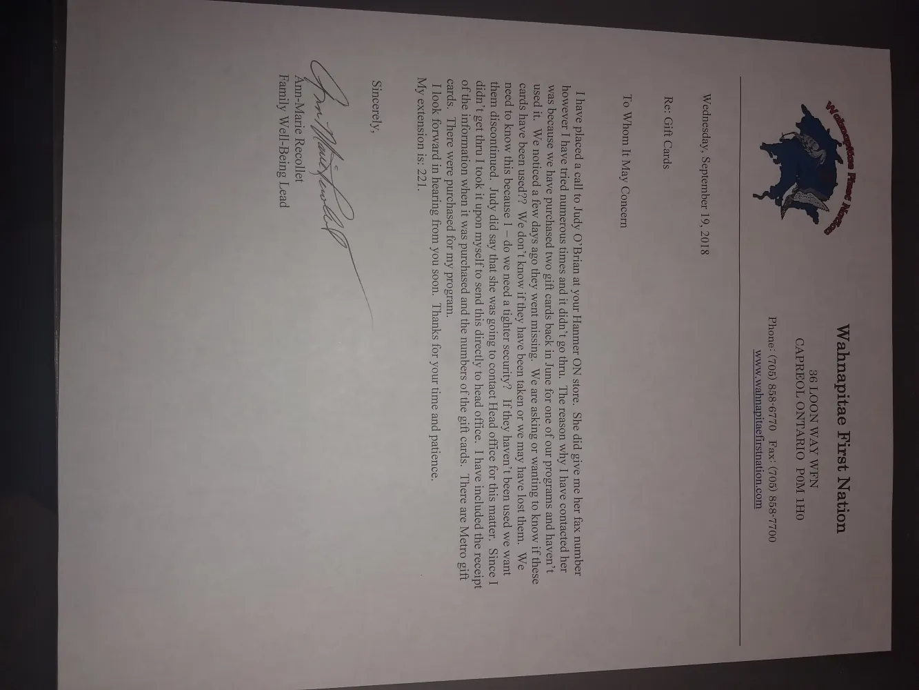 I tried to fax your the main office however it wasn't working. I have faxed the information to Judy O'Brian from the Hanmer ON store. Two of our cards went missing. We aren't sure if someone has taken it or if it was missed placed. We are just wondering if you can track them? I'm sending you a letter from the person's department. Thanks for your time and hope to hear from you soon.