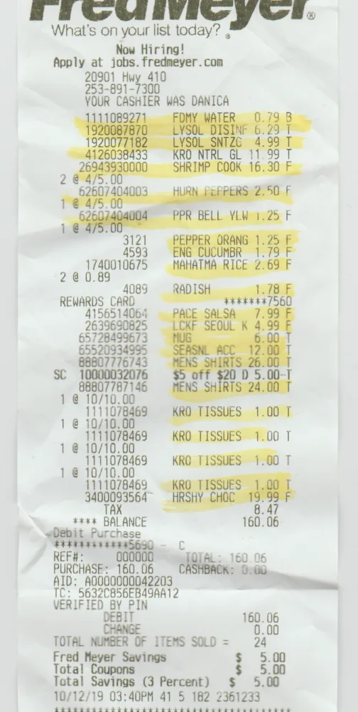 On 10/12/19 I went to Bonney lake Fred Meyer bought 24 items there was a item on my receipt for 11.99 which doesn't match any item I bought. Item number #[protected] Cashier name Danica know one seems to know what the item is or what to do, I want to be refunded for that item, I don't normally complain but being charged for something I never bought i...