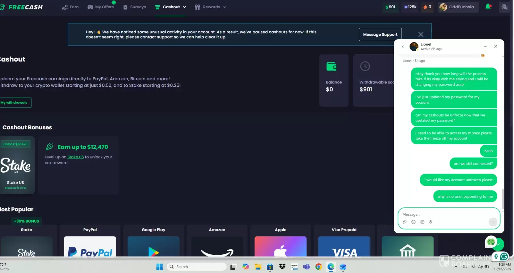 There's a message on my account that says for me to message a live agent but I have numerous times and they haven't reached back out to me I have also sent 5 emails and not one response to me yet what is going on here! I have 901.00 in my pending payout that is now "paused" I was my pending payouts restored for completeing my stake vip level offers!