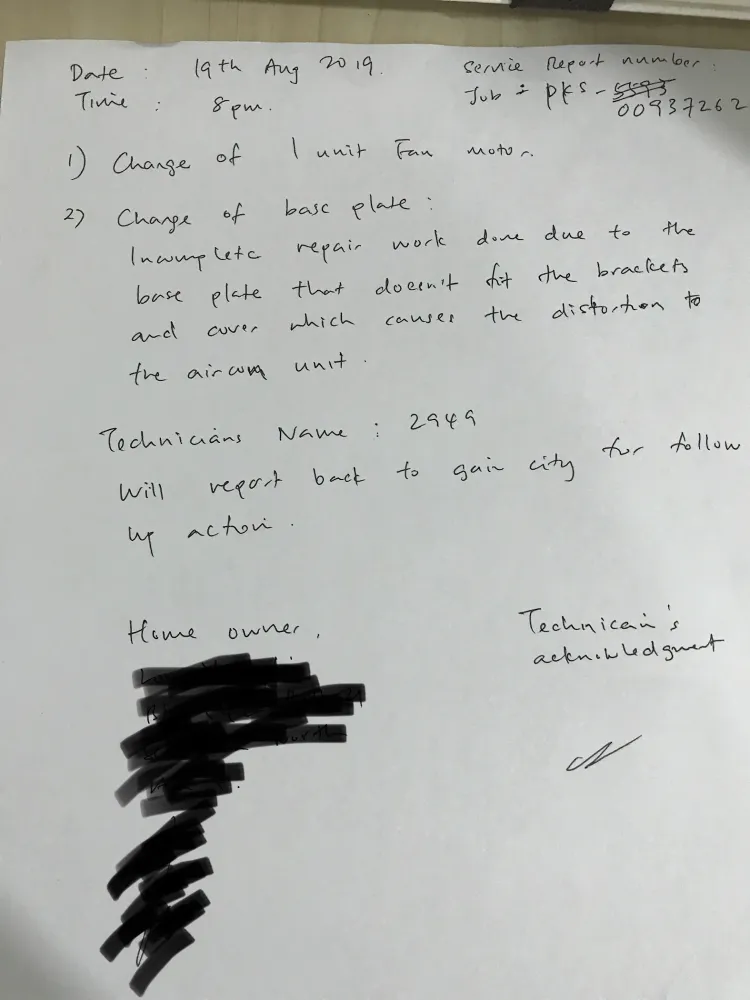 The technician came down at about 10.30am yesterday. After checking the unit, he brushed off and said that he is not able to service it as he has not seen or done this model before. I realized that it was the same person who came on July 9, 2023 (PKS-[protected], Team ID: M-9625) and did a sketchy job after making the same comment.