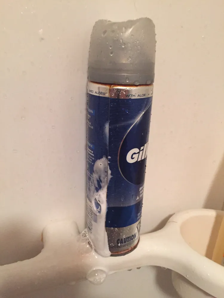 I will attempt to attach photos but I open my sink cabinet to retrieve a can of Gillette Shave Foam. To my surprise there was shaving cream ALL OVER the inside of the cabinet. The can "leaked", not through the "nozzle" which I have had happen prior, but through the SIDE OF THE CAN, as if the cans' seam simply split apart.