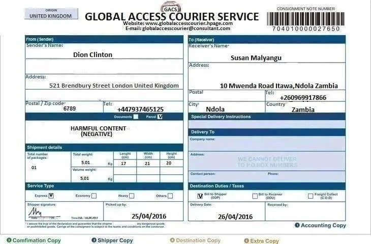 Do note that on contact with the Global courier company, you are to provide them with your