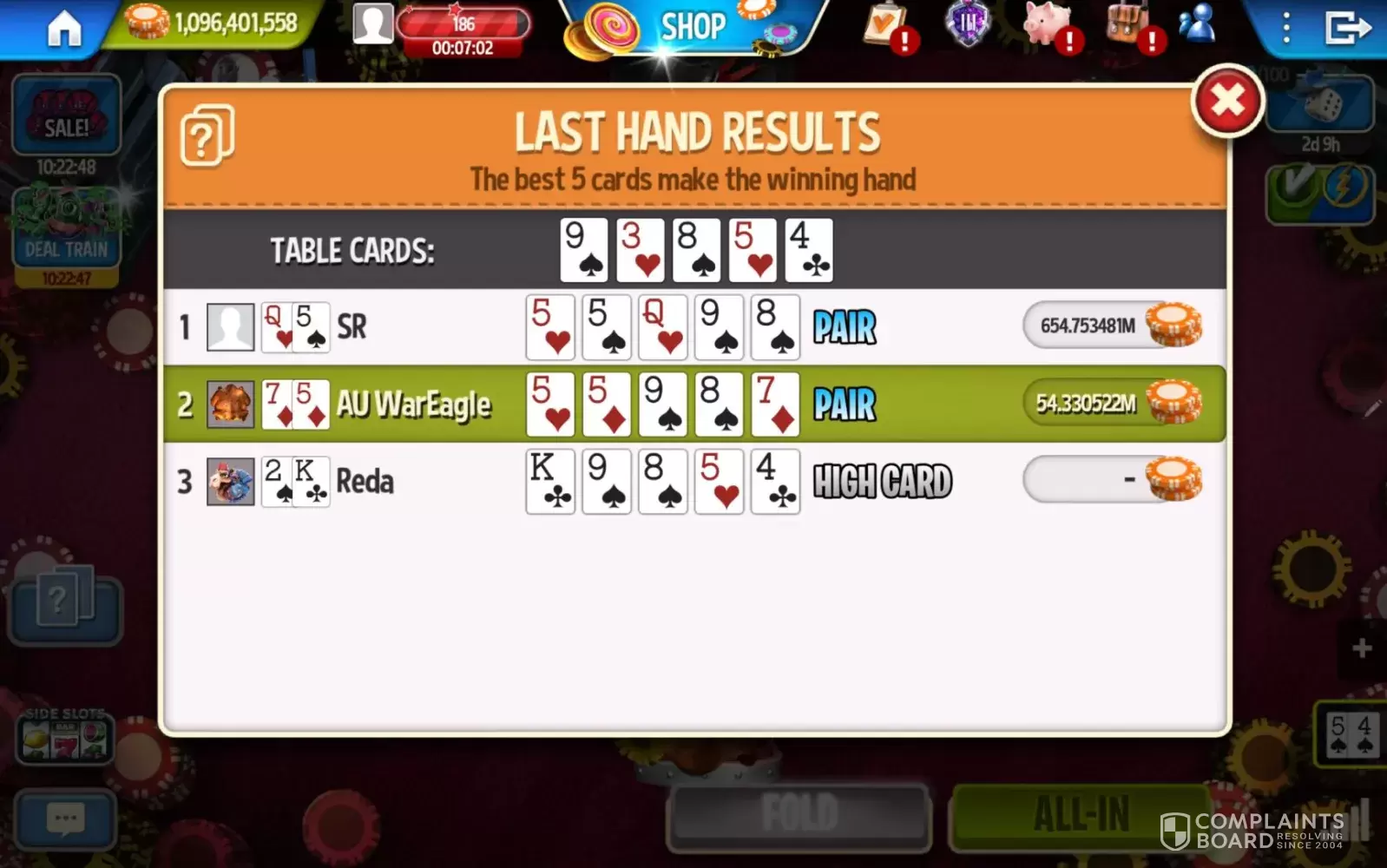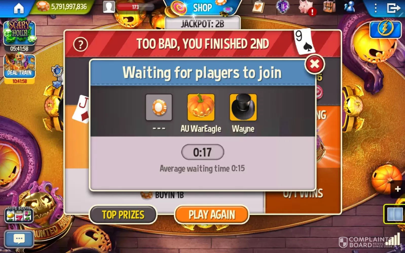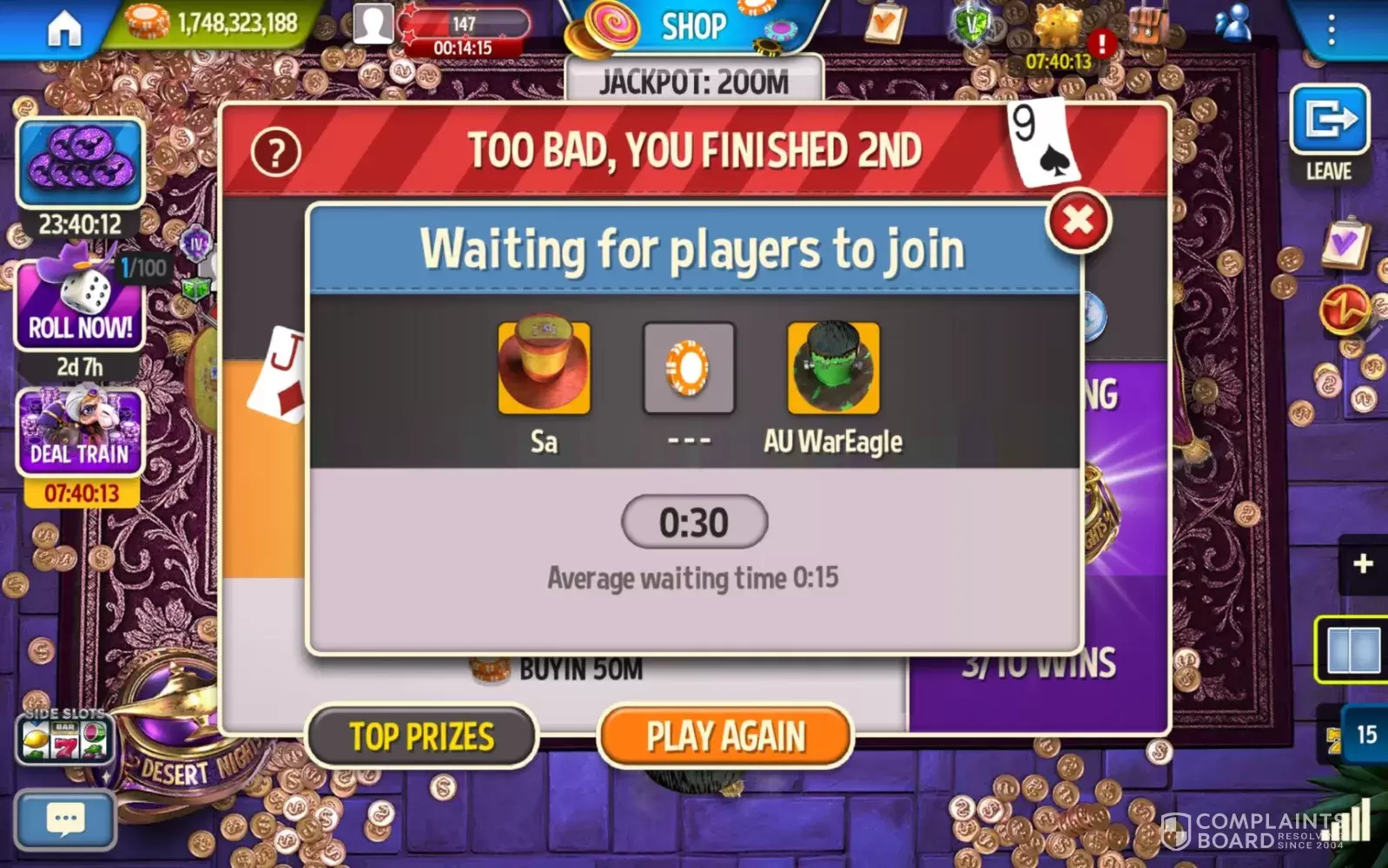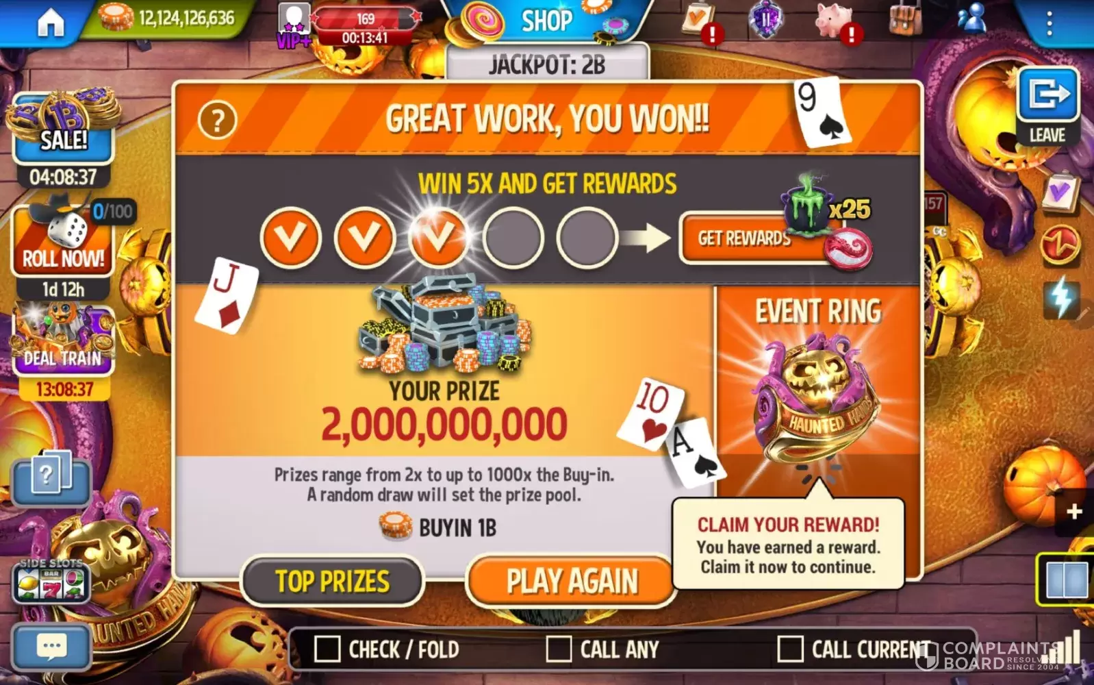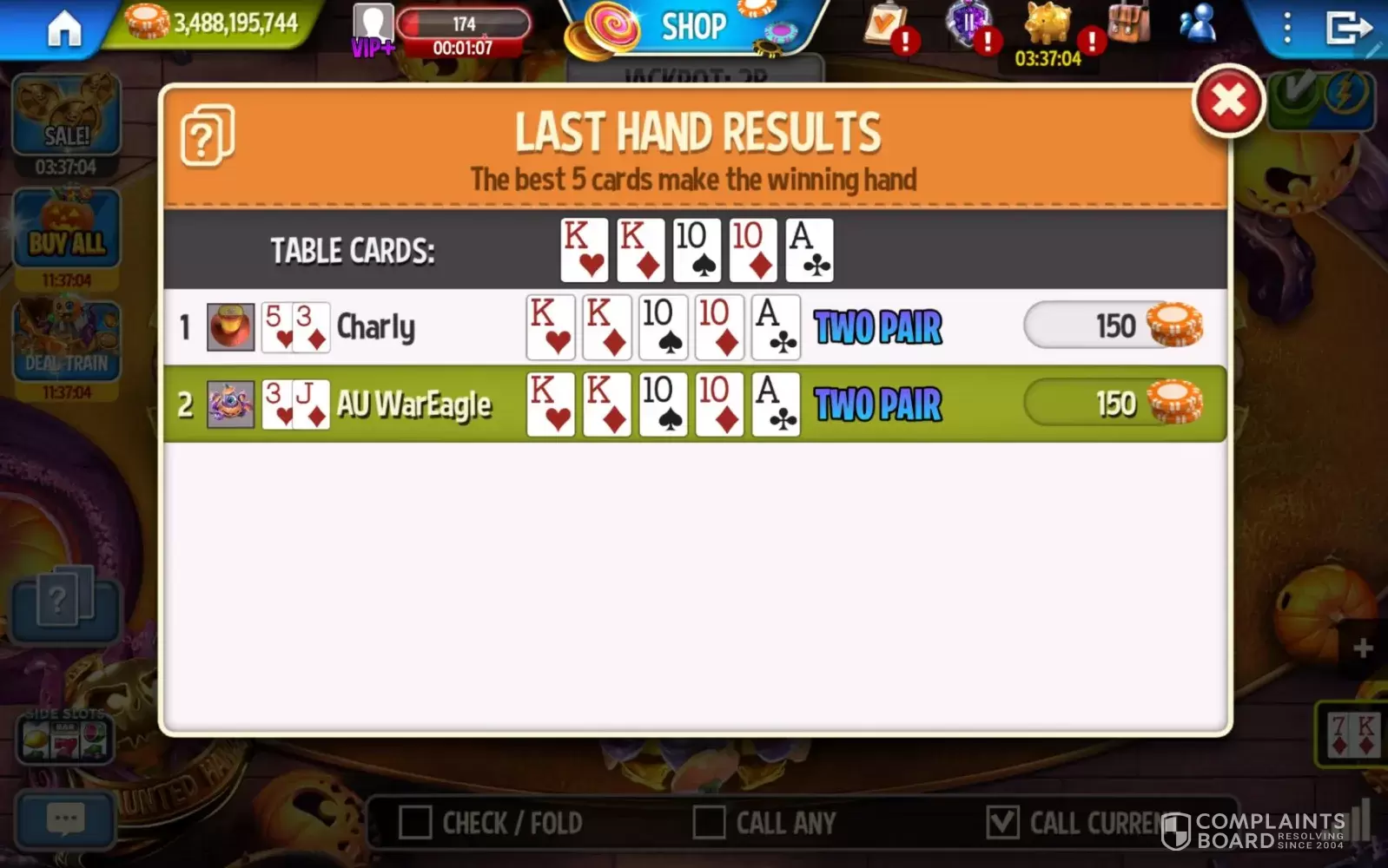 I have spent literally thousands on time on this game. It's only gotten worse. I have taken screenshots of the game landing on the jackpots then it will "land" on next lowest amount. I've been cheated out of 100 billion. The game dealer wins if it has 3club & queen heart but I'll have queen heart & 10 diamond in ultimate governor. But against other players I'd win. I play in actual casinos where Texas Hold'em was invented and this game has it wrong I want my money or my 100 billion chips I have purchased a deal where the minimum win GUARANTEE was 6 trillion and i DIDN'T GET IT. THEY CHEAT PLAYERS OUT OF MONEY