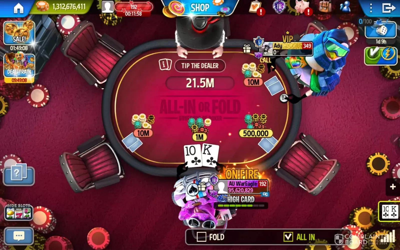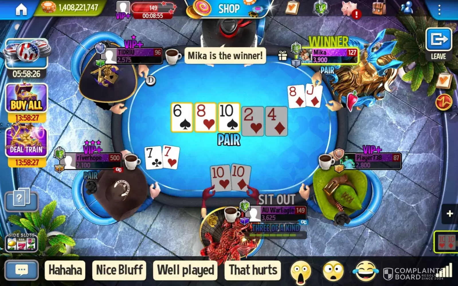 I spent $200 to prove a point, the first couple times you buy anything they throw you many win streaks to get you hooked. After a very short while they stop you from winning anything at all until your chips are gone. By the 3rd or 4th time you purchase something you’ll notice the win streaks come to a halt and the purchased stuff is gone quick. I decided to give it one last whirl 4/09 and purchased $24.99 ticket package, it’s the next morning and it’s gone. Blackjack is the worst but bad beats take your money in the tournaments, KK? they”ll be an Ace everytime. I am removing this joke this minute, it is NOT real poker. Again April/May 2022, same everything except i spend a lot less money, 70 maybe, let me feel excited then get to 500 mil+ they’ll never let you win again. Play smart some purple player will go all in and force you to go in because you have a good pair or 3 of a kind, then get beat on the river. Recently the reception will disappear then boot me back in to see I’ve lost 1/3-2/3 of my balance because i was a robot for a minute so they got free hands then I lose immediately next hand. I’ve lost 30+ spin and win 10 mil buy ins consecutively or more. If this garbage stopped, I’d play in the summer and fall.