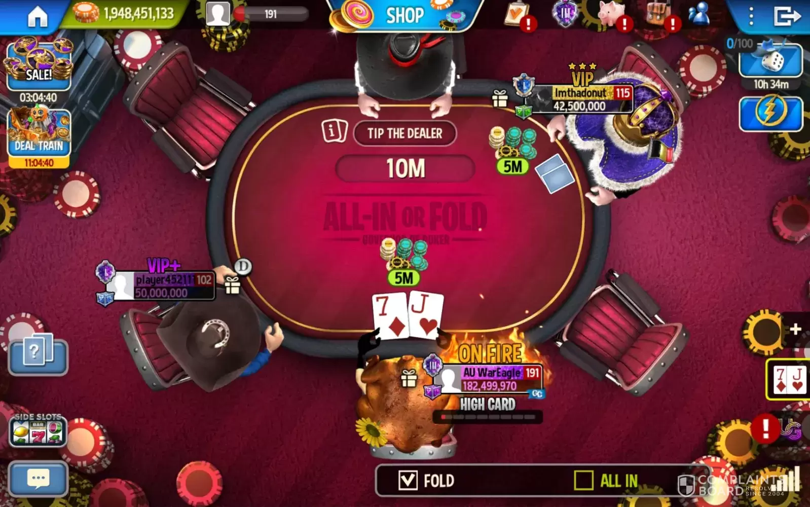 I’ve been playing this game few a couple weeks and this is the shortest time I’ve played on a poker game. The game is actually decent, but the RNG could be improved 3/4 of the time I’m receiving low hand cards while everyone else is receiving good hands. The players are actually the killer of this game. I’ll explain why, I can play a game with players who have less then 2 million and will have fun and play the game with no cares and then you have the players that have 3+ million that will only fold 90% of the time and when they don’t fold they are givin pocket pairs or high [censored], matching suit cards. The little slot machine it’s absolute crap I spent a million on it and all it done was take the money and barely pay out 40-60 thousand here and there. Overall this app kinda ended my interest on poker apps.