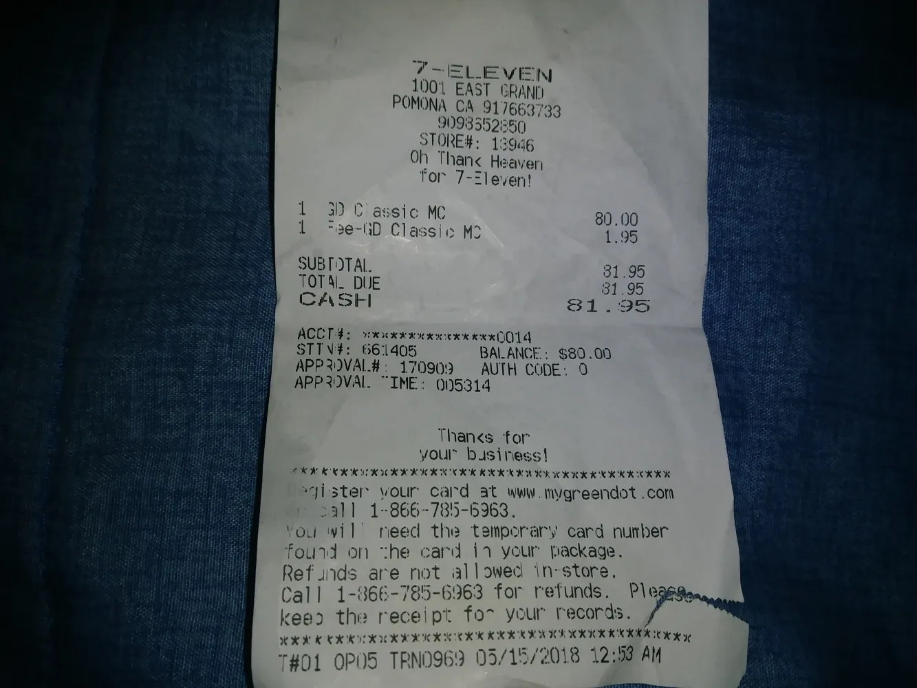 On 5/15/2018 at 12:53a.m. i bought a green dot mastercard at 7 eleven in pomona. I put $80 on card and payed a fee of $1.95 I called customer service to activate card and spoke to somebody to confirm my info. Then i tried to order something online and it said payment declined. So i called customer service to get balance and it said no money on card. The person i talked to also said no money on card