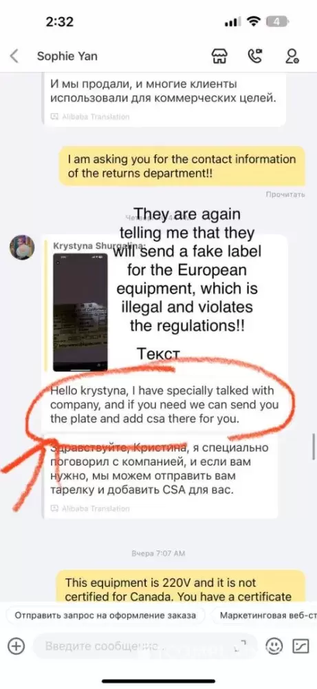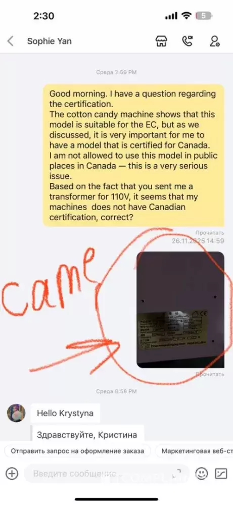In my case, they first sent equipment that does not match the order. I ordered a certified 110V machine for Canada, but they sent me 220V equipment. In addition, they instructed me in chat to download and print a Canadian certification logo myself or to attach some kind of certificate label to the machine. They even admitted in the chat that they have done this many times before for other clients, creating fake certification labels.