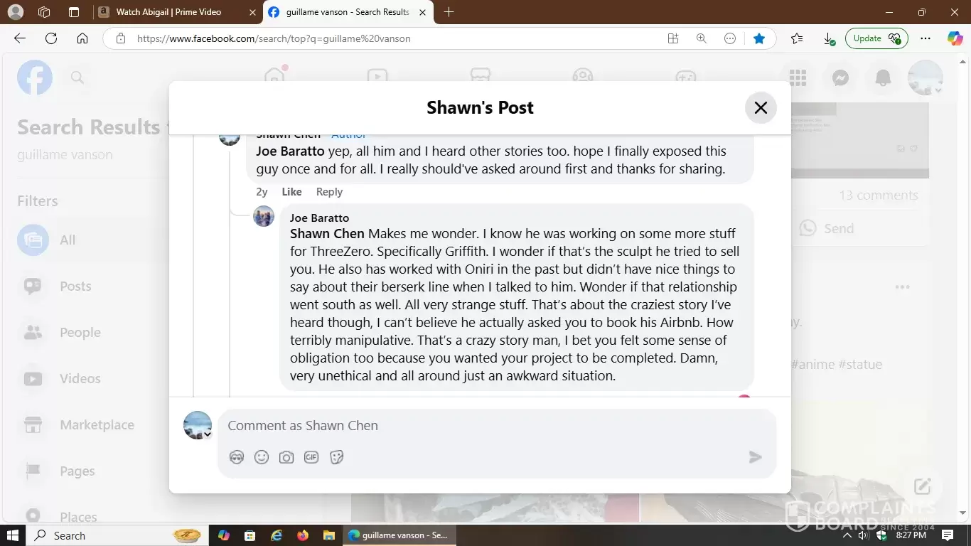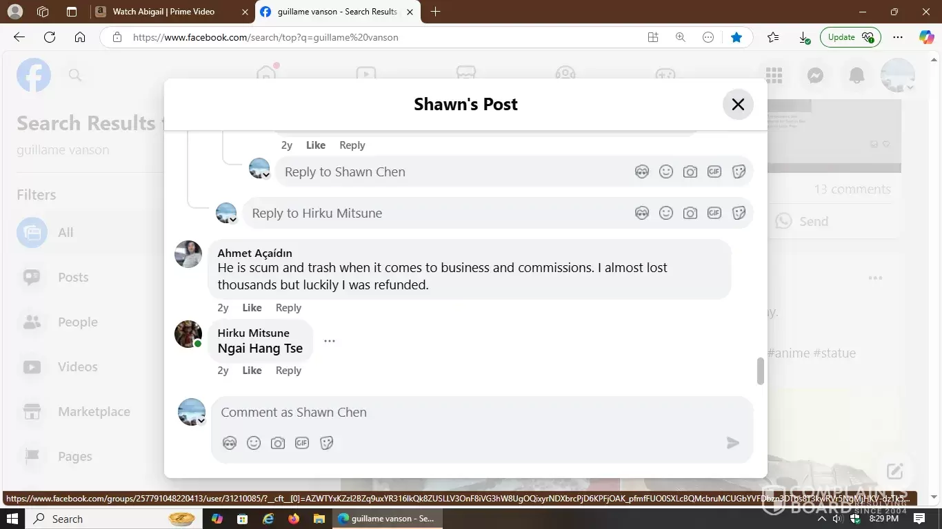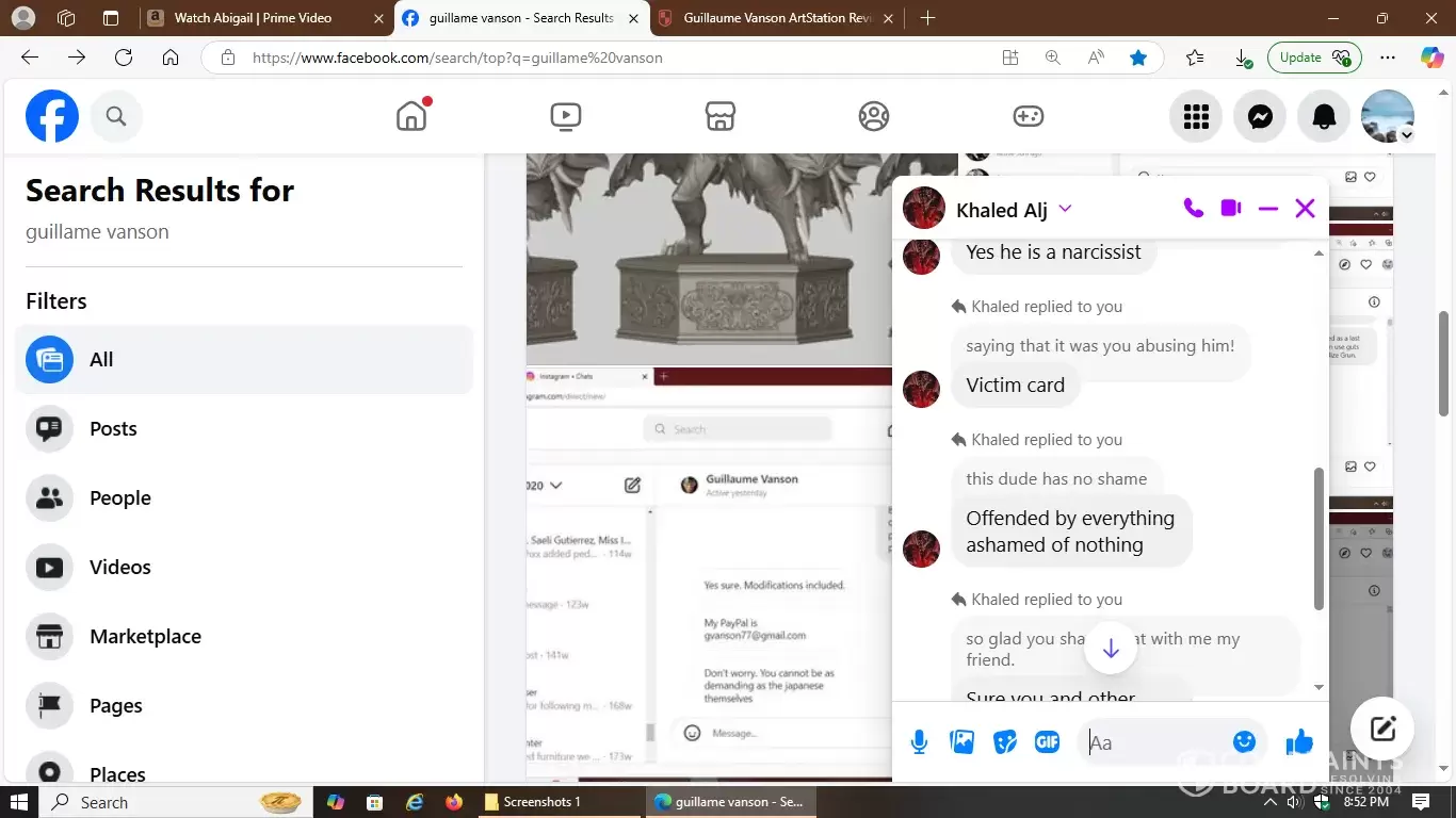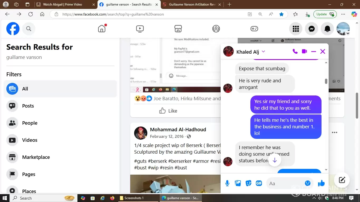 That's the initial link on Facebook with included screenshots of how deceptive, hostile and manipulative this 3D artist is in the world of statue commissions. Carefully observe the multiple responses I received from other victims he scammed prior to my incident. They fully detailed how they were all mistreated and proves a hostile pattern of abuse.