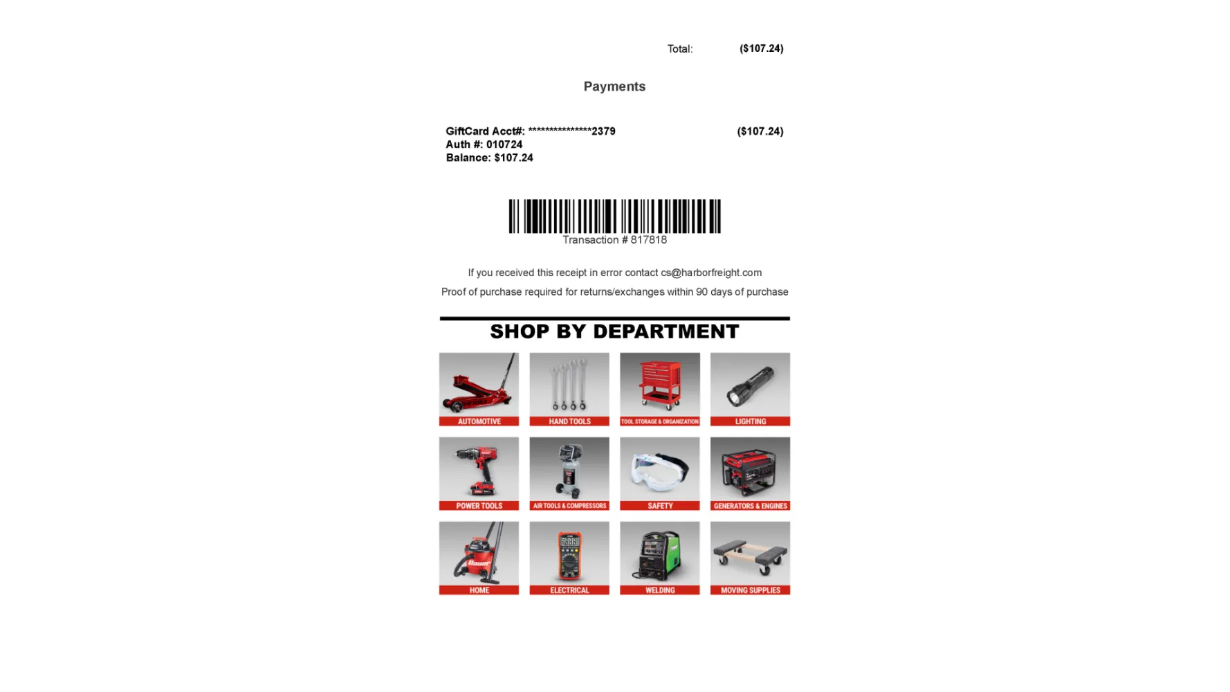 But, when I looked at the back of the receipt, I found out that they collect driver's license information and might even share it with a third party. I felt like a criminal just for trying to return an unopened item with a receipt in hand! It's really disappointing to see such deceptive practices from a company like Harbor Freight Tools. They refused to give me a refund for an item that I had bought less than a day ago, and it wasn't even my fault that it was the wrong size.