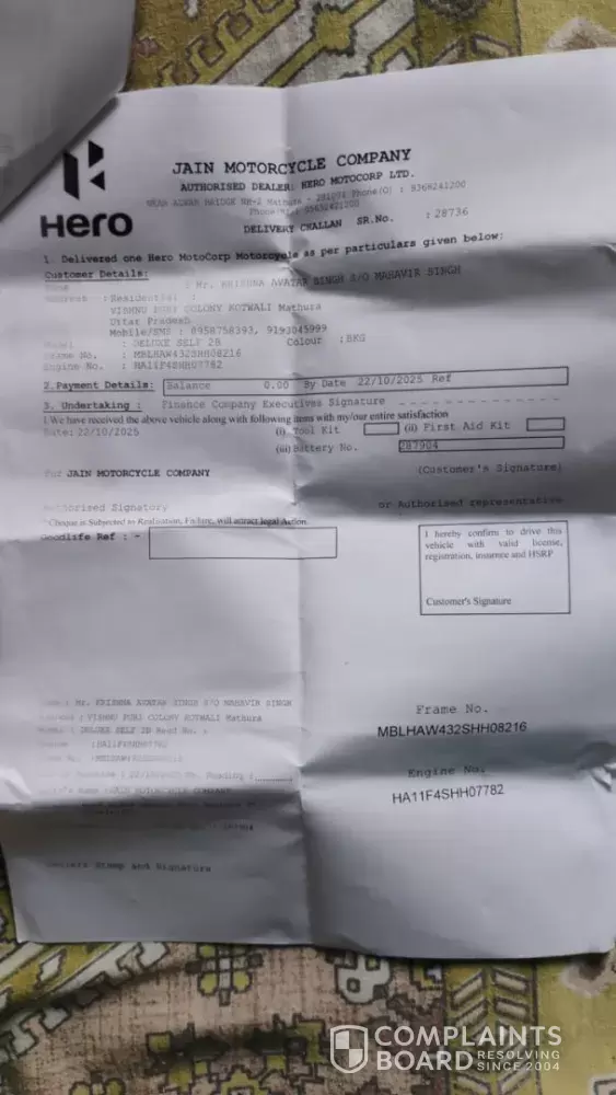 I, Krishna Avtar Singh, Advocate, Chamber No. K-120, Tis Hazari Court, New Delhi, purchased a bike from Mathura Jain Agency on 22/10/2025. All the rear nuts were opened and today on 2/11/2025, when the bike was given for service, more than Rs. 700 was demanded. When some service of the bike is still pending, in the name of service, they are selling their goods in the name of plastic. If there is any accident or harm to my family due to the lack of the vehicle, the company and Jain Motor Agency will be held responsible for it. I am sending the complaint by mail today, 2nd November 2025.