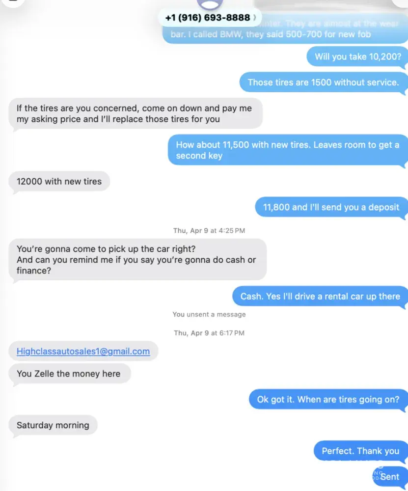 To make matters worse, the deal was supposed to include new tires, but the worn-out ones were still on the car when I arrived. The sales manager, Hash Subhan, refused to honor the original agreement, offering to split the cost of tires, but his pricing changed after reviewing our messages. The tires were quoted at $1,100, then magically increased to $1,500.