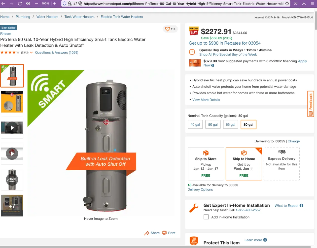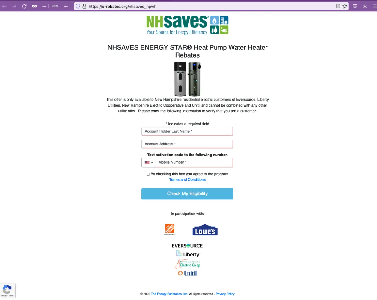 I am located in New Hampshire State. We have energy efficiency rebates run by NHSaves.com Home Depot has ProTerra 80 Gal. 10-Year Hybrid High Efficiency Smart Tank Electric Water Heater on sale for $2,272.91 from the "MRSP" of $2,841 (internet# [protected] / Model# XE80T10HS45U0. In this product page they have a link stating "Get up to $900 in rebates for 'my zip code' ". I click through and i am very familiar with this program. This link sends has a home depot pop up with a link to "Get instant Rebate" which takes me to "https://e-rebates.org/nhsaves_hpwh" which as me to enter my last name, home address to where the water heater will be installed and my phone number. It will check my eligibility and then ask which of the two big box stores i will purchase the water heater. I click onto Home depot and i will have a PDF generated from my energy company and with a rebate code number with bar code. It shows the Home Depot Logo with the words below the logo " In-Store Purchase".