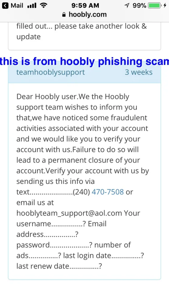 Dear Hoobly user.We the Hoobly support team wishes to inform you that, we have noticed some fraudulent activities associated with your account and we would like you to verify your account with us.Failure to do so will lead to a permanent closure of your account.Verify your account with us by sending us this info via text...[protected] or email us at hooblyteam.[protected]@aol.com Your username...? Email address...? password...? number of ads...? last login date...? last renew date...?