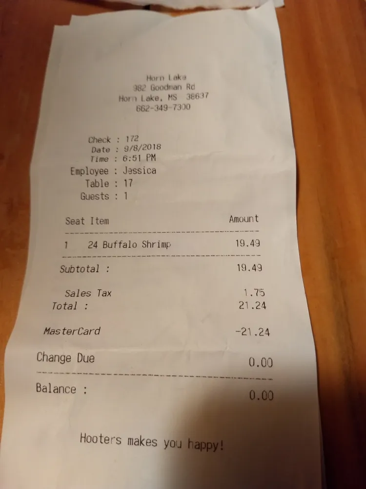 Well when our food was delivered we still had not received silverware yet... My wife's order was fine... However mine was NOT even close to being accurate ! First of all NONE of my chicken or shrimp had ANY extra hot sauce on it so they were far far from being very very wet ! Also my regular 6 breaded wings that were supposed to be ALL DRUMS ! Well those 6 were 2 drums and 4 flats ! Everything was dry as heck ! This meal was PATHETIC to say the least... I have been eating at Hooters since 1983 when it began in Clearwater... But without a doubt it was the WORST meal I have ever eatin in my lifetime...