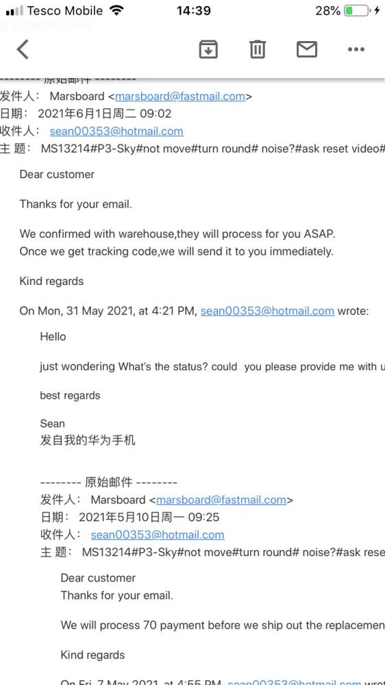 I asked marsboard could they arrange courier to get the hoverboard fixed, since they have failed to reply to my emails.