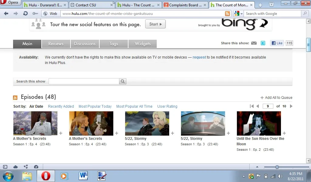 I do really love hulu, and I love the strides that they have taken with anime distribution companies in order to make anime more available to a wider audience. One thing that does bug me about their practices is how they go about separating dubbed anime and anime only with subtitles. There is no checkbox in the search options that I have found, and when on a show's page, the dubbed and subbed versions are no longer segregated. When a viewer is looking for a specific version, it is extremely aggravating to have to sit through four ad blocks just because the viewer clicked on the incorrect version of the episode to start with. A mere wrong click isn't the issue--it's that I have to get through the opening ad, the opening credits, the second ad, and then hear two seconds of audio to realize my issue. It would be great if I could just take half a second to read "Subtitled version, " or even head off the issue by searching only for "Dubbed." The attached picture shows an episodes list, with two unlabeled versions of every single episode.