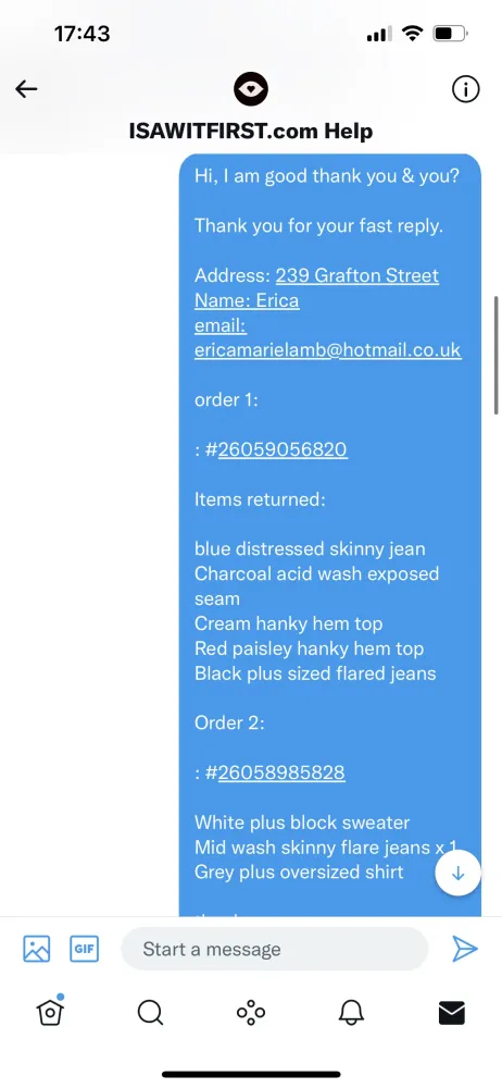 I sent 2 orders back in December. Still awaiting a refund. I contacted I Saw it first on 1st Jan via email no reply so I contacted again, still no reply. So I then moved on to Twitter, to get responses that ask for info then blank you. Really awful customer service. This brand owes me a total of £130!