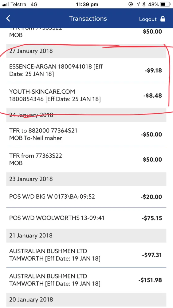 The monies taken shows all different emails on it such as shopargan.com skinflawless.com