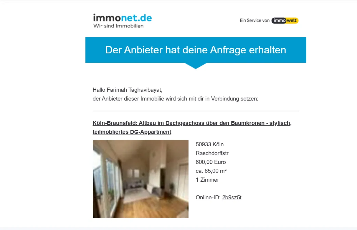 please be inform that, during last week I had applies for some apartments from your website( the evidences is attached). The owners had contacted me by Email and tried to get my information such ad ID card and phone number , ... after that they persuaded me to pay the total (Kaution) and rental amount to reserve the private visit. all Emails are saved and I will give you them for more clarification. I got that, they are committing frauds since they asked for money which need to transfer to non German bank account. finally they treated me to report me and complain me since I need to pay the rental reservation amount however nothing had confirmed by me.