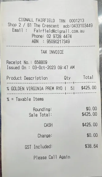 I am writing to talk about a recent purchase of tobacco products. Specifically, I bought "Golden Virginia Prem Ryo" with the code 0E192J5 0222 on 3 October, 2023, from a store in Sydney. It costs me AU$425. I have included a copy of the receipt to show you.