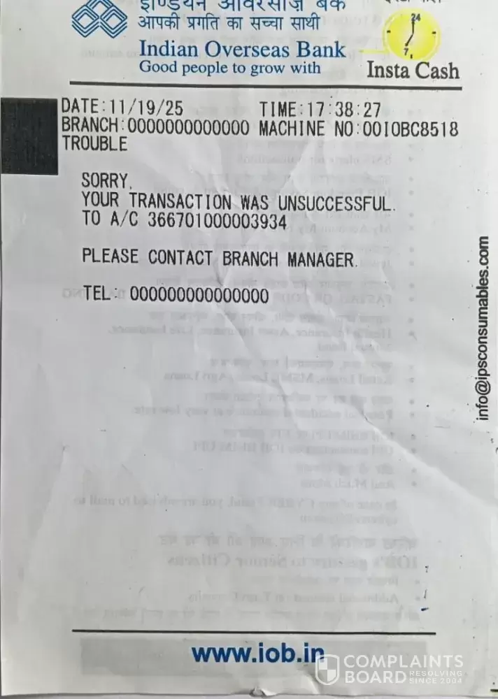 I am writing to raise a complaint regarding a failed cash deposit transaction at an Indian Overseas Bank ATM, which has still not been resolved even after 4 days.