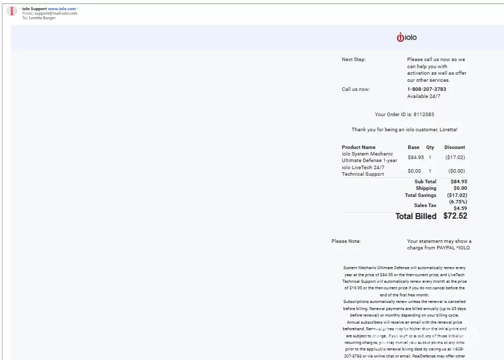 On 9/18/25 I ordered System Mechanic Ultimate Defense for $75. On 10/18/25 I ordered IOLO Updater for $21.34. Got my credit card bill on 11/18/25. I had 1 charge for $21.34 for Updater and 3 charges for Technical Support for $21.30. So unknown to me an auto pay was set up by IOLO and because I didn't read, "System Mechanic Ultimate Defense will automatically renew every year at the price of $84.95 or the then-current price, and LiveTech Technical Support will automatically renew every month at the price of $19.95 or the then-current price if you do not cancel before the end of the first free month. Bait and switch for sure: iolo System Mechanic Ultimate Defense 1-year $84.951($17.02) iolo LiveTech 24/7 Technical Support $0.001($0.00). Shows $0.00 then you get billed. Never ever buy anything IOLO. I purchased my Clean My ID - 3-year contract for $300 and after 6 months found out the $300 was for use of the software for 3 years but monitoring was 1 year - nowhere was this disclosed. Be smart, save money, save time - stay away from IOLO everything. Oh, by the way, their response to me was that the charges were legitimate.