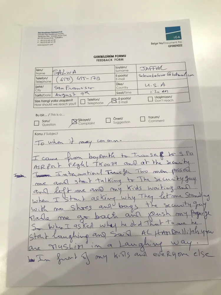 I would like to file a complaint regarding a brutal, racist, and unprofessional behaviour at the Istanbul airport.