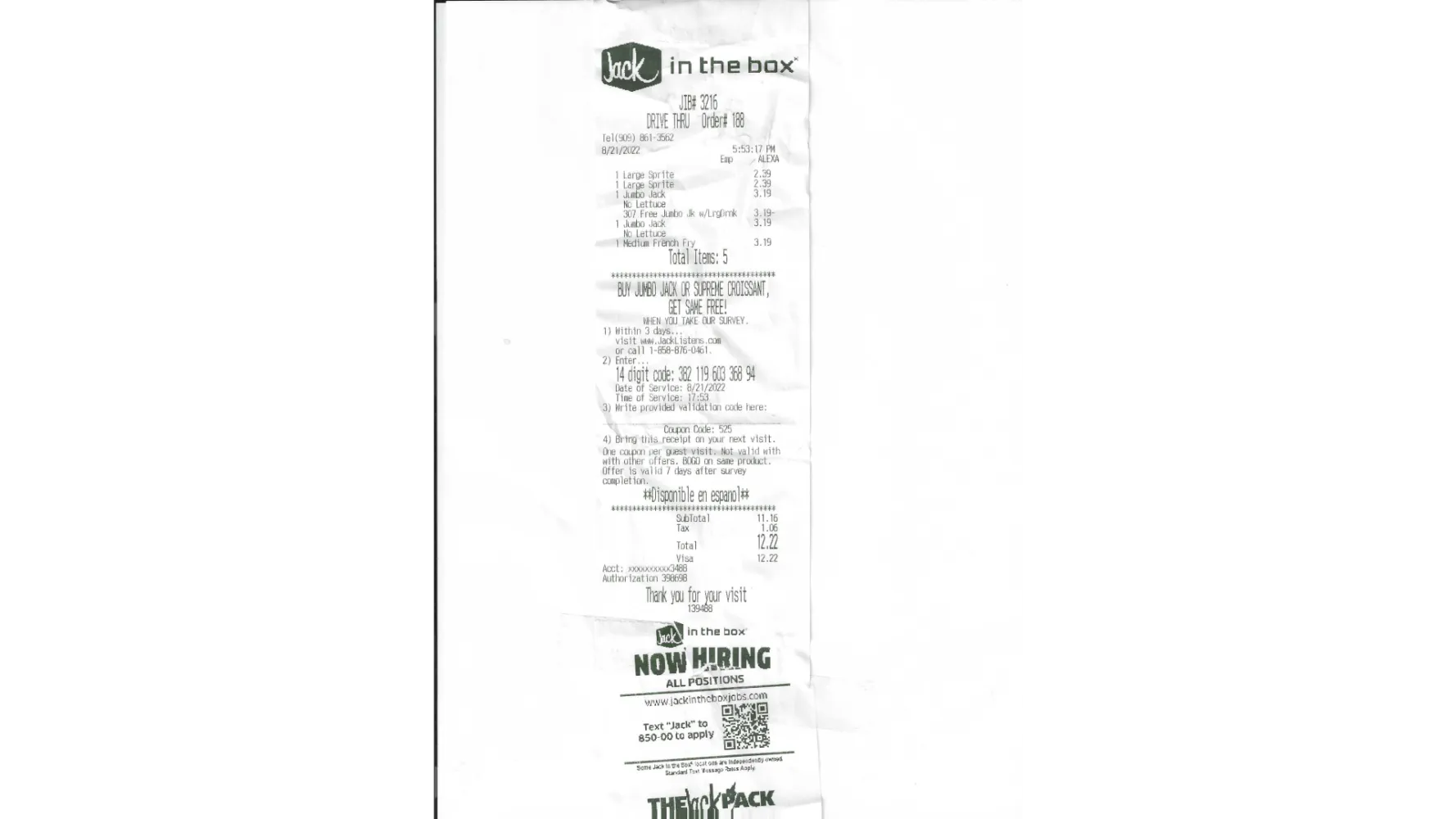 On Sunday August 21, 2022 in Diamond Bar, Ca 91765, at 5:53 p.m. my wife and I went to Jack in the box and ordered the Dodger promotion for two. The employee did not know about the promotion even through they had a sign in the drive thru. We had to explain and was given the order back to us. We were given the order and my wife looked at the receipt and we were charged for one of the Jumbo Jacks. We ordered two drinks and a order of French fries and told the employee for two. Attached is the receipt showing the charge. I would like either a refund or some type of compensation. Don't have a promotion without informing everyone of such.