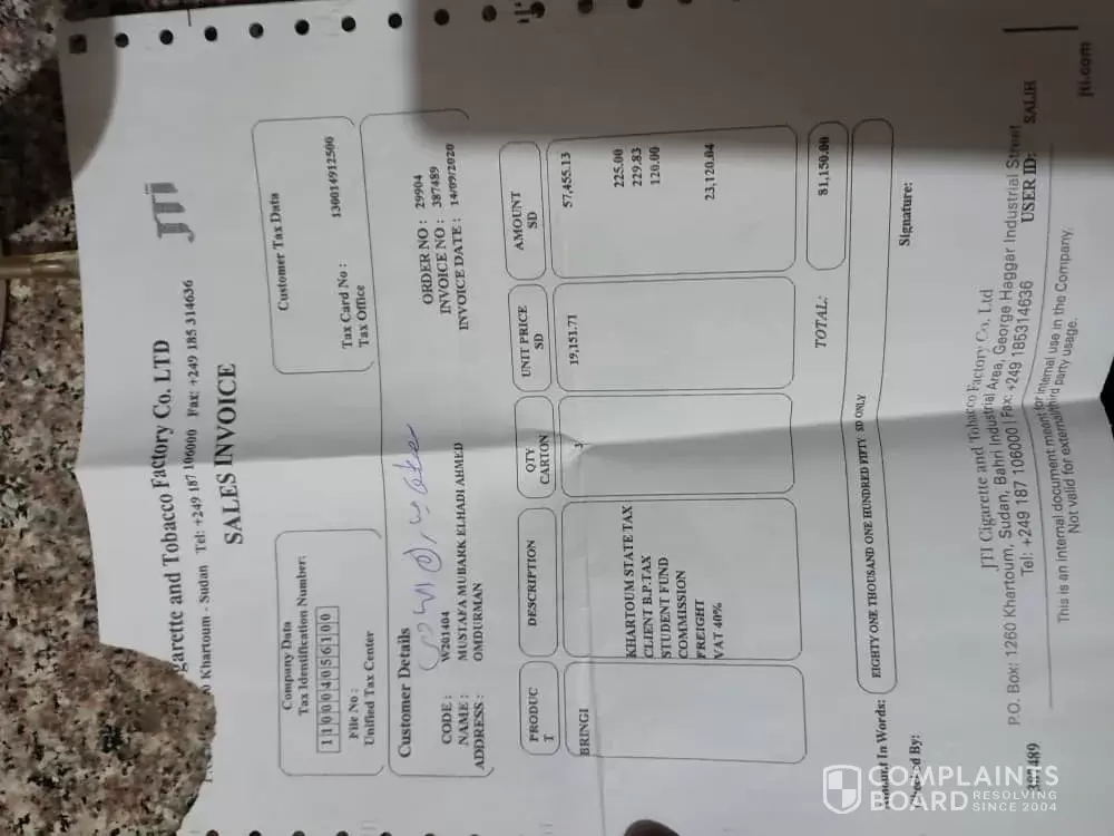 I am the only one on this page whose problem has not been resolved. I do not know what to do or who to contact. I hope that the management of the Japanese Tobacco Company will stand with me in my problem in the Sudan branch. Thank you very much. Just solve this problem and give me my share of Japanese tobacco company products in Sudan. I sent many messages to the company regarding distribution to me in Sudan, but I did not know or find a solution. I am an agent for the company and I have a tax number and a code that I do not know. It has been three years and no one has cared about my problem.