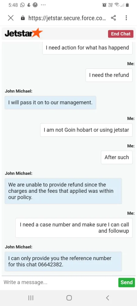 I also am not satisfied in the complaint procedure with Jestar - I couldn't converse with a supervisor (I chatted online and also called - in both circumstances, they couldn't put me on to a supervisor. In the telephone call they transferred me to no-one and then the phone just dropped out), they couldn't provide me with an email to send a written complaint etc. To me, this simply isn't good enough as a consumer. I specifically asked for a customer care case to be raised to raise a complaint about how I was being treated and they stated they could not do this over the phone and it would have to be done online via the 'Contact us > Complaints' page - however, there was no option on that page for me to contact anyone.
