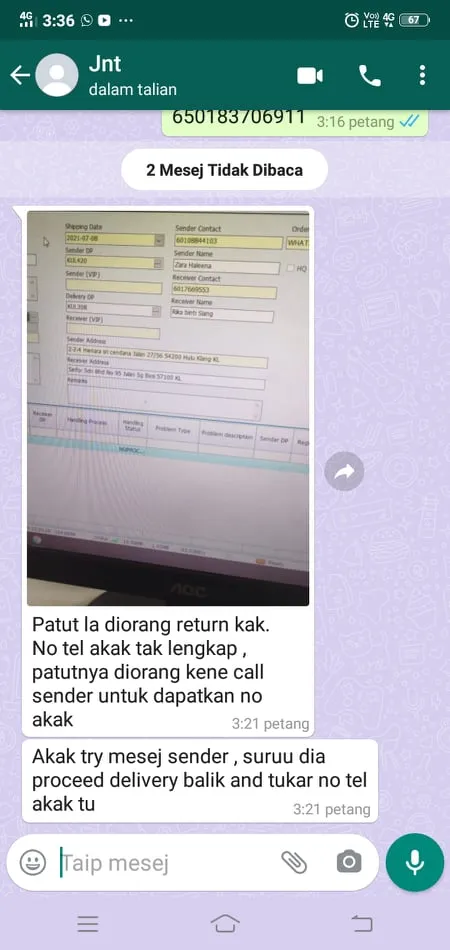 Saya mohd aszeri bin mohamad seller dr jb.. Harini 06/08.2021 jam 4ptg telah menerima aduan dr customer sy di pahang atas nama noraini bte abdul rahman [protected] bahawa parcel yg hendak diterima dr curier telah rosak/pecah. Customer sy membuat keputusan utk tidak menerima parcel tersebut & dibawa semula oleh pihak curier jnt..
