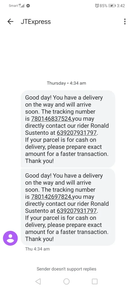 I have this shopee delivery, the delivery date as per shopee status was september 13, 2019 and the currier was j&t express. On that day I did not received any delivery from them instead they called me september 14, 2019, 3:30pm and I told them if they can deliver it on monday september 16, 2019 because the address im using was company address and we have...