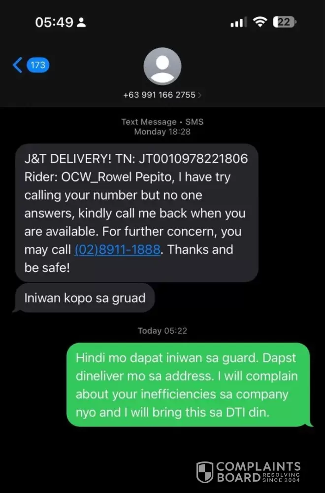 The courier did not deliver the parcel to the recipient's address, and yet Rowel Pepito declared it delivered on Dec 22, 2025, at 18:28. He called, but I was not able to get it, so he must have brought my parcel to my address. He was already inside the subdivision and already at the guardhouse, which was only 5 min away. I checked with the guard as claimed by the courier but the guard said that they did not receive the item.