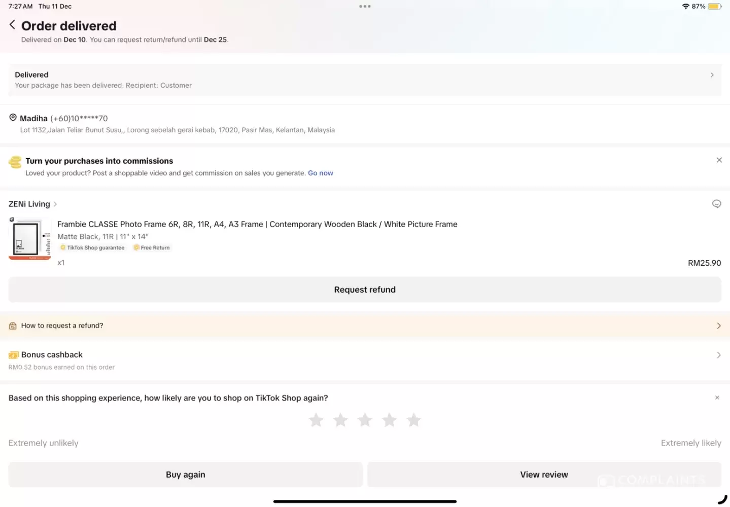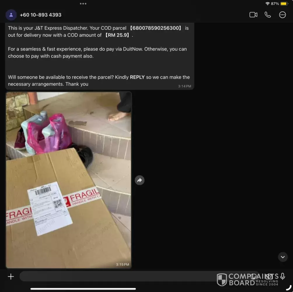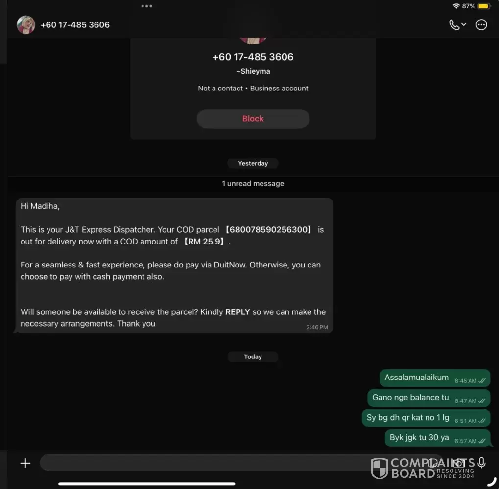I would like to lodge a complaint regarding a Cash on Delivery (COD) parcel. On [10/12/2025], I handed over RM56 in cash to the courier. The price of the item was RM25.90. Therefore, I should have received a balance of RM30.10. However, the courier only promised to transfer the balance, but as of this morning I have not received any response or payment. I kindly request your assistance to investigate this matter and help me recover my balance.