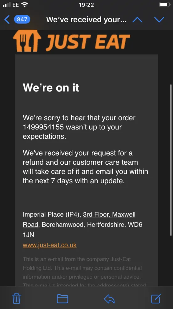 On Thursday March 31st I Made my weekly Takeaway Order, this time with Burger King in Ipswich. The order was paid for and confirmed by both Just Eat, PayPal and the branch of Burger King at 16:14pm, with requested a delivery time of about 18:15pm. I arrived home early from work, and both myself and my wife waited in our Lounge (we live in a terrace house and this room is right at the front of the house for our food to arrive. The only sound we heard outside pertaining to a takeaway delivery was next door at a little while after 18:00. When my wife became concerned as to where our food was, I looked at the order screen, and it showed "18:20", "waiting for update" (with a spinning hourglass), and "driver assigned". At about 18:30pm I decided to try and telephone the branch of Burger King, but was unable to get anybody to pick up at the other end on three separate occasions (between approximately 18:30pm and 19:10pm), it simply rang and rang until the line beeped. At 19:30pm, the order screen finally changed status, to "DELIVERED", still with the time "18:20". I was understandably furious about this, and left a triple 1-Star review as a result. I have attached to this complaint a screenshot of the confirmation email I received from Just Eat (with order number), one of the order screen on the Just Eat Website with it's review, and one of the PayPal confirmation email, complete with date and time (31/03/2022, 16:14).