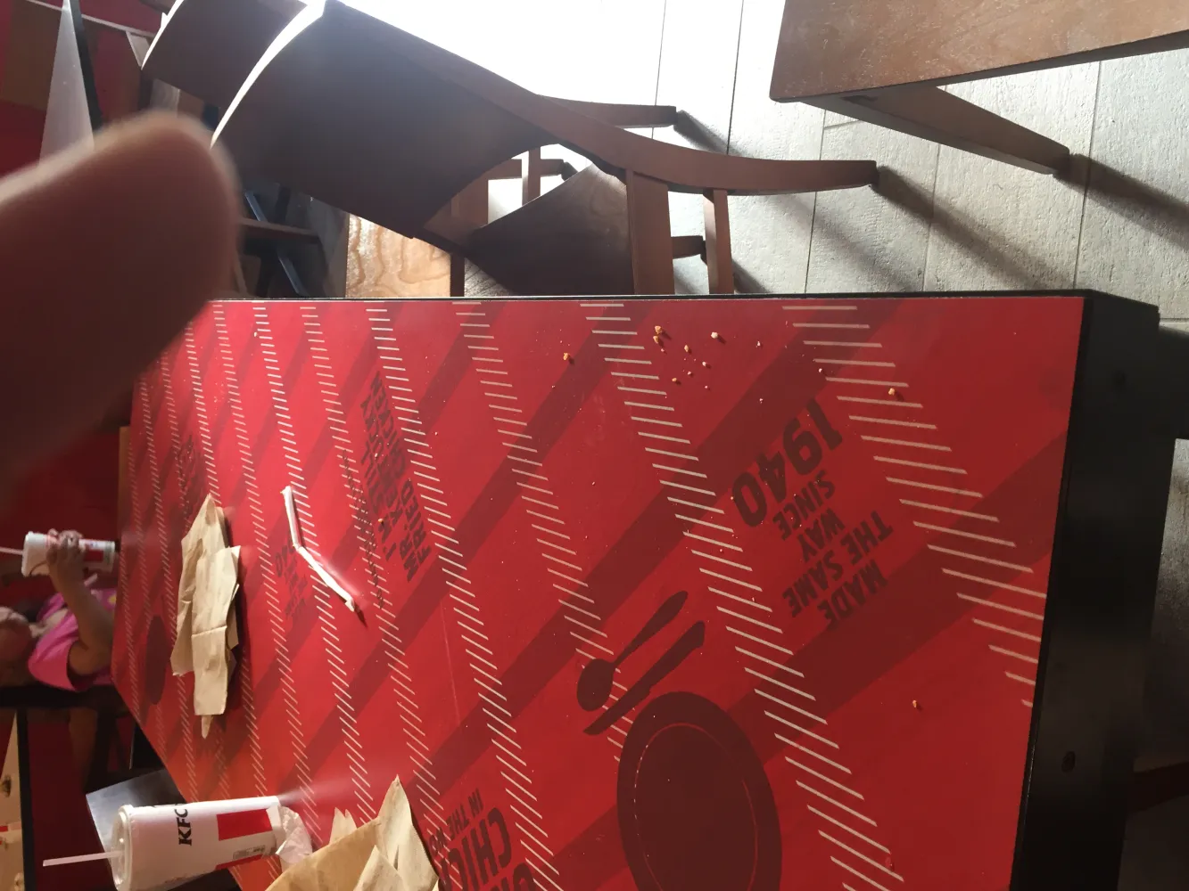 I made the mistake of bringing my 5 year old daughter, and 3 year old son in this place for a meal. There was trash and food all over the floor of this restaurant!, huge chicken crust crumbs on many tables, and spilled fountin drink liquid in front or every dispenser - so disgusting. We waited 19 minutes to get our meals! I can not help but wonder if our food was contaminated by the same employees who allowed the dining room to become (and stay so filthy! I actually felt ashamed that I stayed in that filthy restaraunt with my kids. I had to wipe the table just to be able to sit.