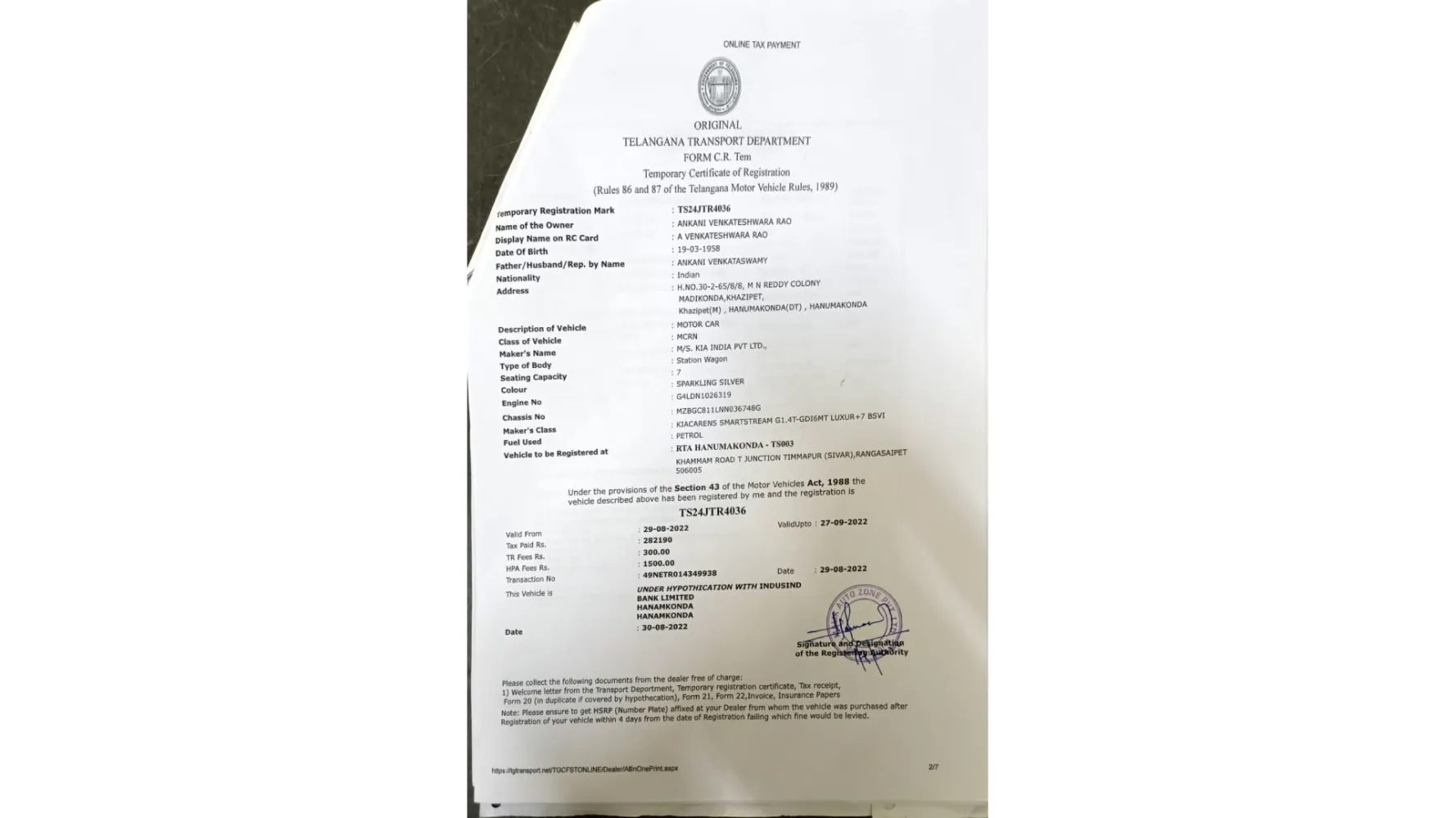 I purchase KIA Sorento A/T 3.5L FWD clear white color, chassis #NNAUM53BZMP700342, engine # G6DCMS248985 from quetta city office. invoice # [protected]