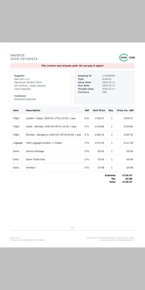 12/3/2020 I paid with MasterCard $686 for a round trip ticket DFW-EWR-CDG on United and Brussels Airlines through kiwi.com online travel agency,