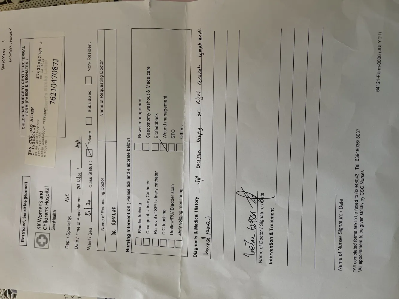 My son Tan Jun Hao Aiden (7621047087J) after having excision biopsy of right cervical lymph nodes operation on 15/12/21, was discharged on 17/12/21 at 11:30 am.