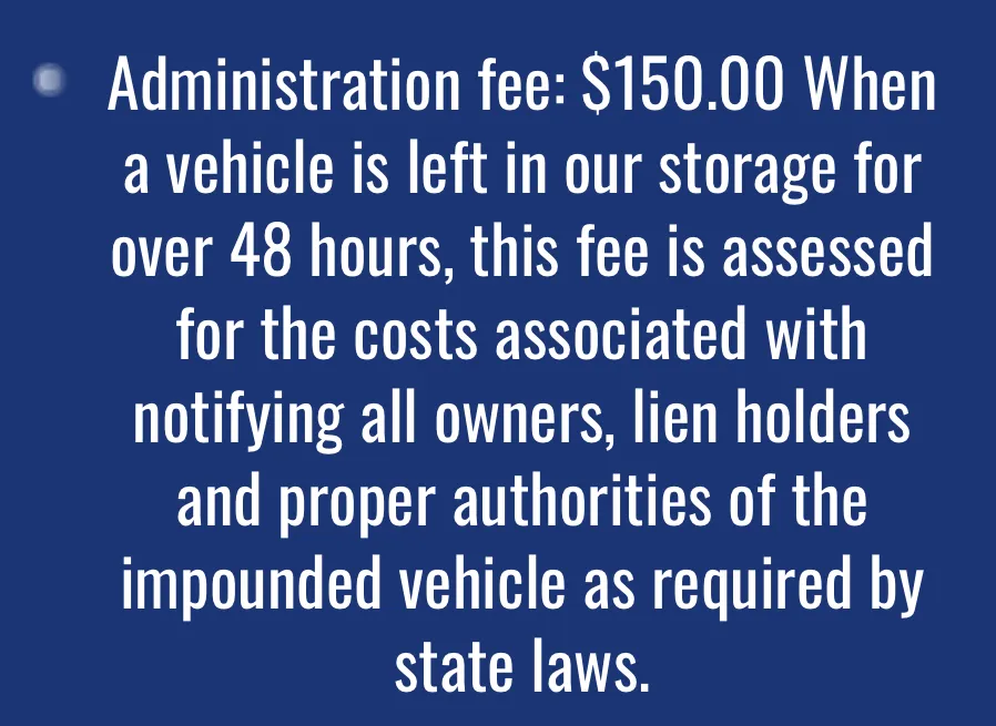 Klaus Towing advertises $150 admin fee specifically for the purpose of notifying owners, courts and others (as required by law) after vehicle has been left for 48-hours. I have been towed twice in the last six months by Klaus and the total charge for my vehicle left for 4-days was $530 and most recently $470 after 3-days and neither time was notified by mail, phone or otherwise but in actuality I reached out to them. I questioned the policy the most recent time and was told “...the fee is still applicable” which leads me to believe the lack or absence of filing not to mention the inflated price to do so.