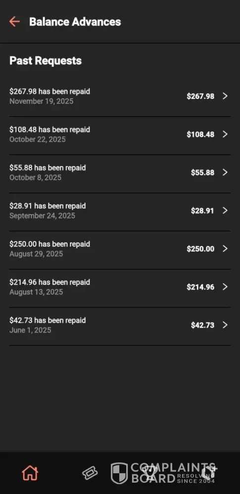 I got about 8 advances and worked up to a $250 advance. I repaid that balance on November 19, which is 34 days away from making this post.