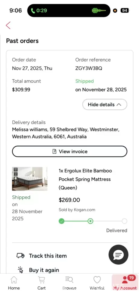 Order date Nov 27, 2025, Thu Order reference ZGY3W3BQ Total amount $309.99 Shipped on November 28, 2025 Hide details Delivery details Melissa williams, 59 Shelbred Way, Westminster, Western Australia, 6061, Australia View invoice Ergolux Elite Bamboo Pocket Spring Mattress (Queen) Shipped on 28 November 2025 1x Ergolux Elite Bamboo Pocket Spring Mattre...