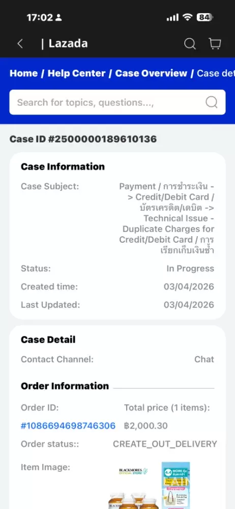 On 3 April 2026 I placed one order on Lazada Thailand (Order No. 1086694698746306) for THB 2,000.30. My Bangkok Bank Be1st debit card (account ending x3786) was charged twice — at 01:45 and 01:47 — two completely separate transactions with different bank reference numbers: