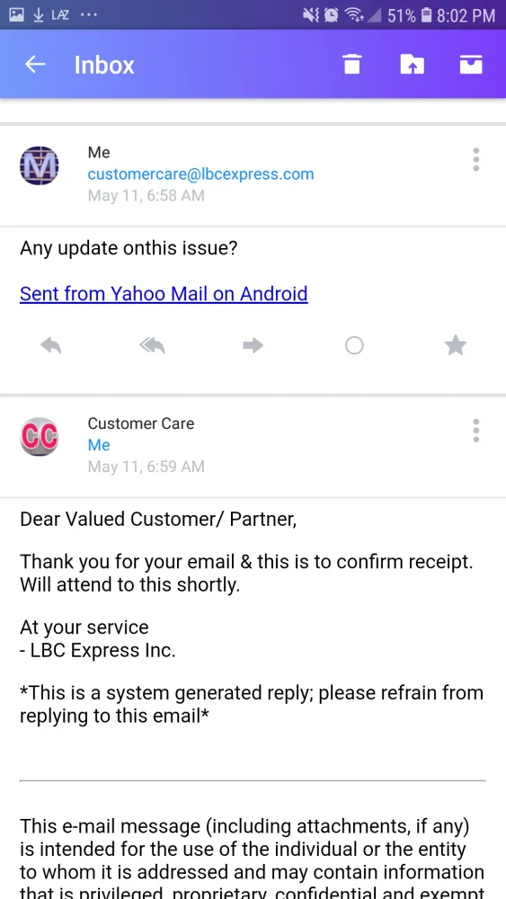 May 20 around 11am to 2pm.today I went back to LBC SM East Ortigas. Your crew told me that status is already enchash. I waited for so long 2 to 3hours because they told me that they already email again the error and just wait for the response. After an hours of waiting, I just took my lunch and go back to them. The guy crew told me that there is no response yet and the most irritating part? He accused me that maybe I received the cash already that's why the status is already encash. How come I will go back and forth to your branch if I ready received the money?