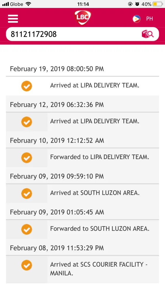 Package sent thru lbc branch in commonwealth to be shipped to tondo manila only. It's already March 14 and still, package was not delivered with last update on Mar 4th! Poor customer service too when we called hotline.