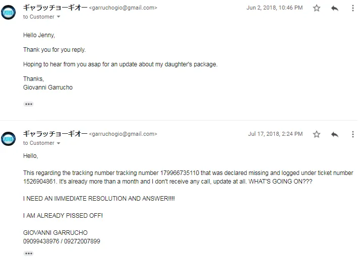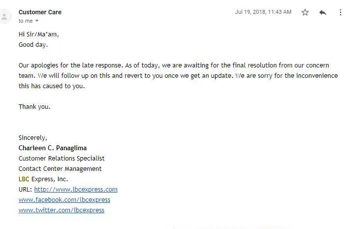 The delivery of the parcels (2 boxes) from New York USA to Mabalacat City Pampanga was incomplete. The tracking number was [protected]. I tracked it on your site and it says that its already in the LBC sea cargo warehouse at Manila since August 8, 2018. 6pm. I received the first box with tracking number [protected], the delivery staff just said that it was forgotten. How was that possible? We need to claim that parcel as soon as possible. We already acknowledged the fact that the weather lately was bad that may cause delays with delivery. But the reason of the delay of the parcel that we should have had received few days ago was negligence of the staff handling the sorting and delivery. I look highly and patronizing your company until this happened.