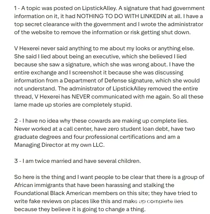 Yes, Vhexeri exposed her LinkedIn when she left her screen open and forgot to hide when she posted a photo on LSA. This is how she was exposed. She was indeed ugly and worked at a call center. She was a nobody. On lipstickalley her persona changes every 5 years which shows you how long she been on the site. She pretends to be an author, researcher, owner of managing firm, has multiple degrees and professional certifications but notice she can never go into detail about those things? There is even a thread in the job forum about how to get a federal job and she has never once posted in that thread since its existence but claims she was some exec at a black engineering firm. First she was pro black then pan african and now she is FBA at the ripe old age of 60. Go through her post history. pascha28 is a prolific story teller.