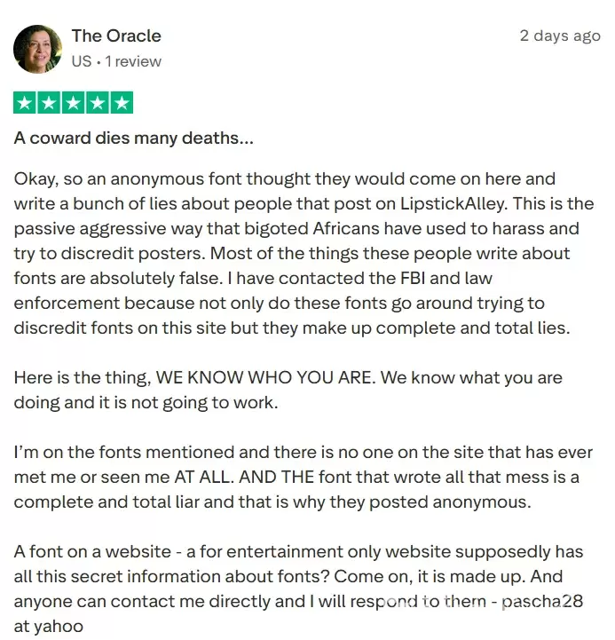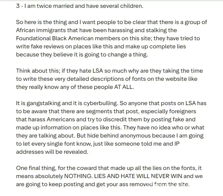 Look at how dedicated she is to LSA. She lives on that site yet let her tell it, she is some high up executative with her own managing firm. This is also how stupid she is. She stated she has secret clearance yet provided PII in this review she left. pascha28atyahoodotcom which is what she wrote is also PII. Her and her FBA minions are manless and bitter so they take it out on everyone else.