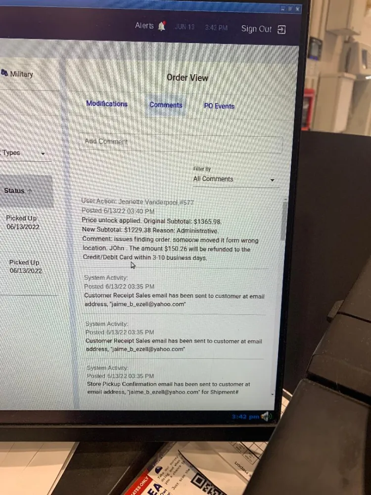 I live in New Orleans, LA. I bought a Frigidaire fridge on line on 6-9-22 to be picked up on 6-13-22. Since this fridge was for a new house in Mobile, AL, we had to rent a U-haul trailer and drive 2 hours to pick up the fridge. The "Pick Up" department emailed me and texted me that my order was ready for pick up. I confirmed prior to my arrival that I was on my way (at least 1-1/2 hours before). We arrived and it took 2 more hours and 3 different managers to find the fridge in the back to bring up for us to load. The excuse was that they had to unwrap it to verify the model number as pertaining to my order, and then they had to re-wrap the fridge (which is why it was taking 2 hours). Managers John and Chase finally got the fridge and helped us load it on the trailer. John processed a discount of $150.26 (due to the recall on the icemaker which had to be replaced) and showed me the computer entry (I have a pic of the computer screen), but that discount never posted to my Lowe's account. Needless to say, my husband and I barely made it back to Mobile, offload the fridge by ourselves, and then return the U-haul trailer before it closed. We let the fridge rest overnight before plugging it in.