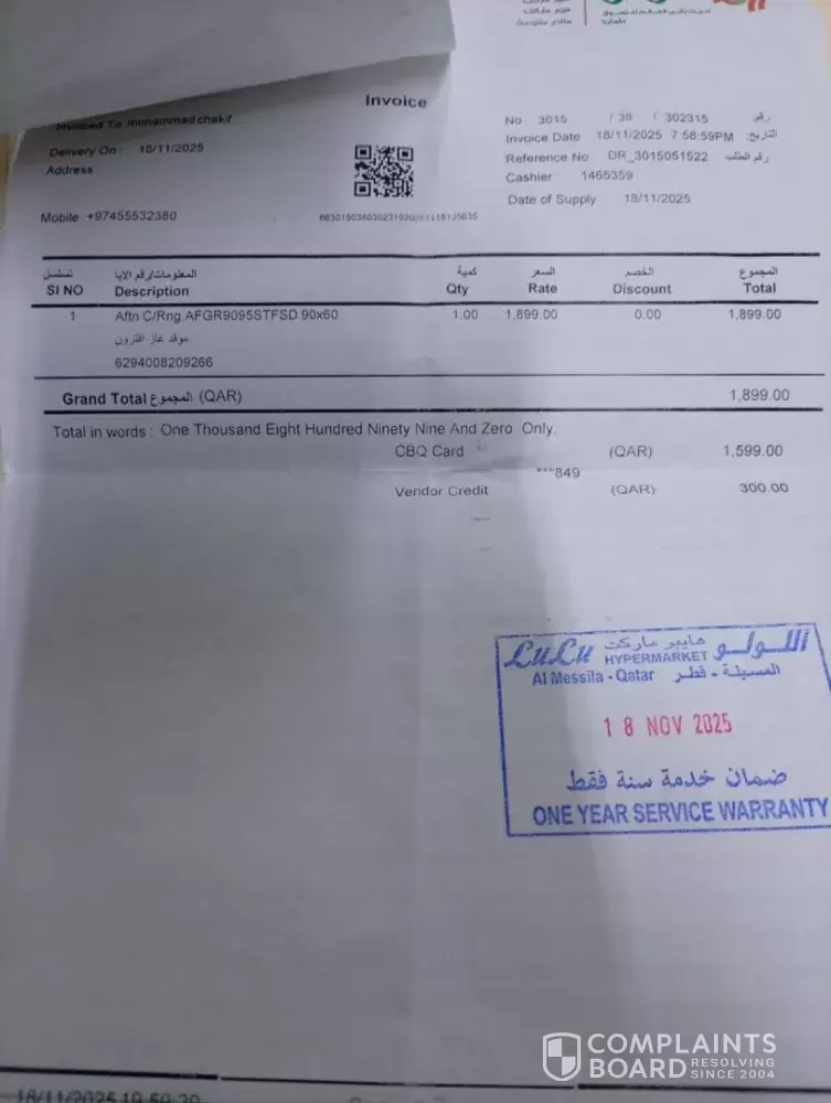 I am writing to raise a formal complaint regarding a cooker I purchased from your hypermarket approximately 18th Nov 2025